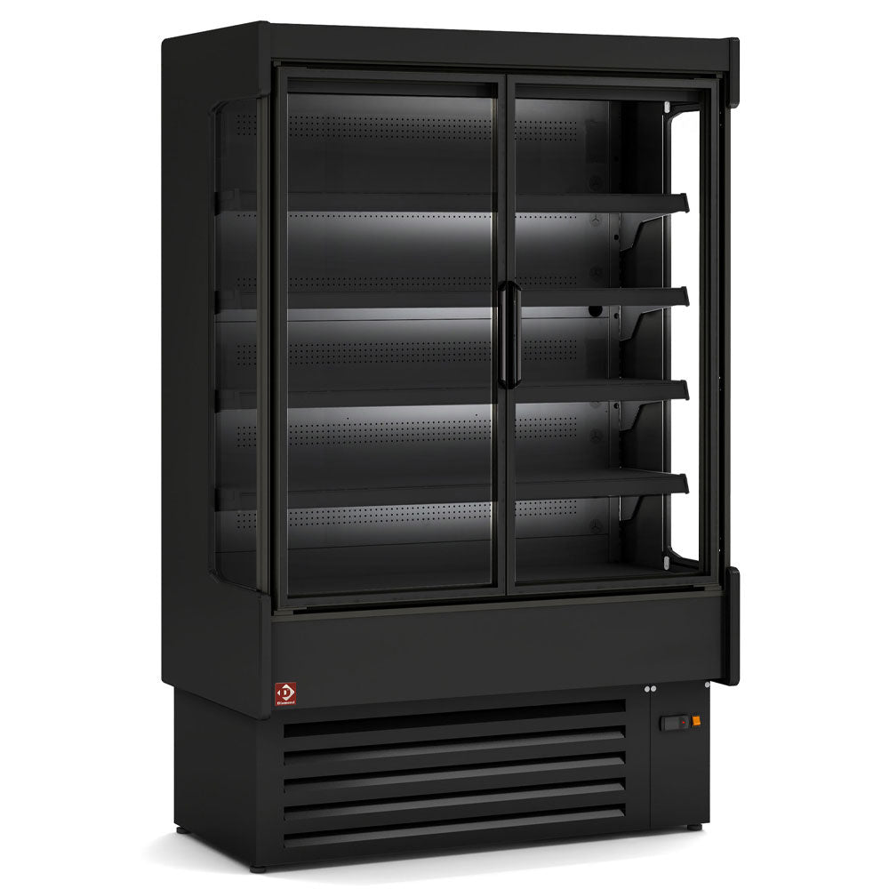 Klapdøre. Kølemiddelgas R290. Beregnet til selvbetjening af sandwich, mejeriprodukter, ost, frugt, pålæg, drikkevarer. Dybde 653 mm. Udvendigt lavet af sortlakeret stålplade, ABS-sider, “panorama”-sider. Sort epoxy perforeret kumme og rist. LED-topbelysni