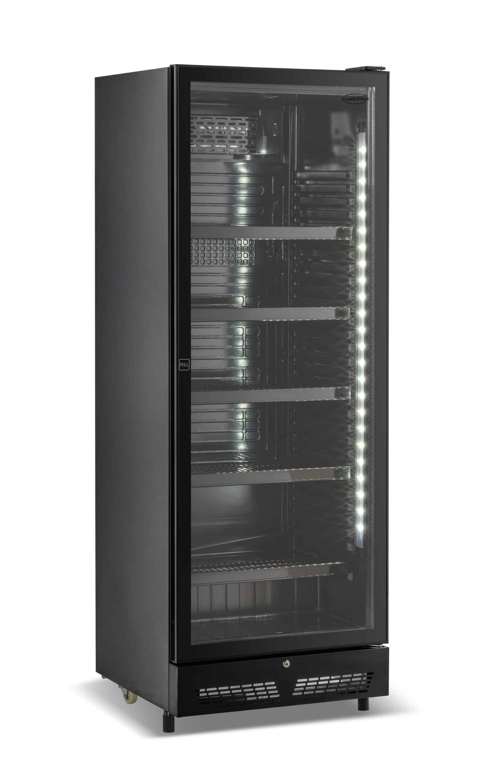Combisteel køleskab med 1 glasdør – sort SVE-450 BL Professionelt displaykøleskab med elegant sort design Dette professionelle køleskab med én glasdør er velegnet til barer, caféer, restauranter, kiosker og detailmiljøer, hvor både funktion og visuel pr